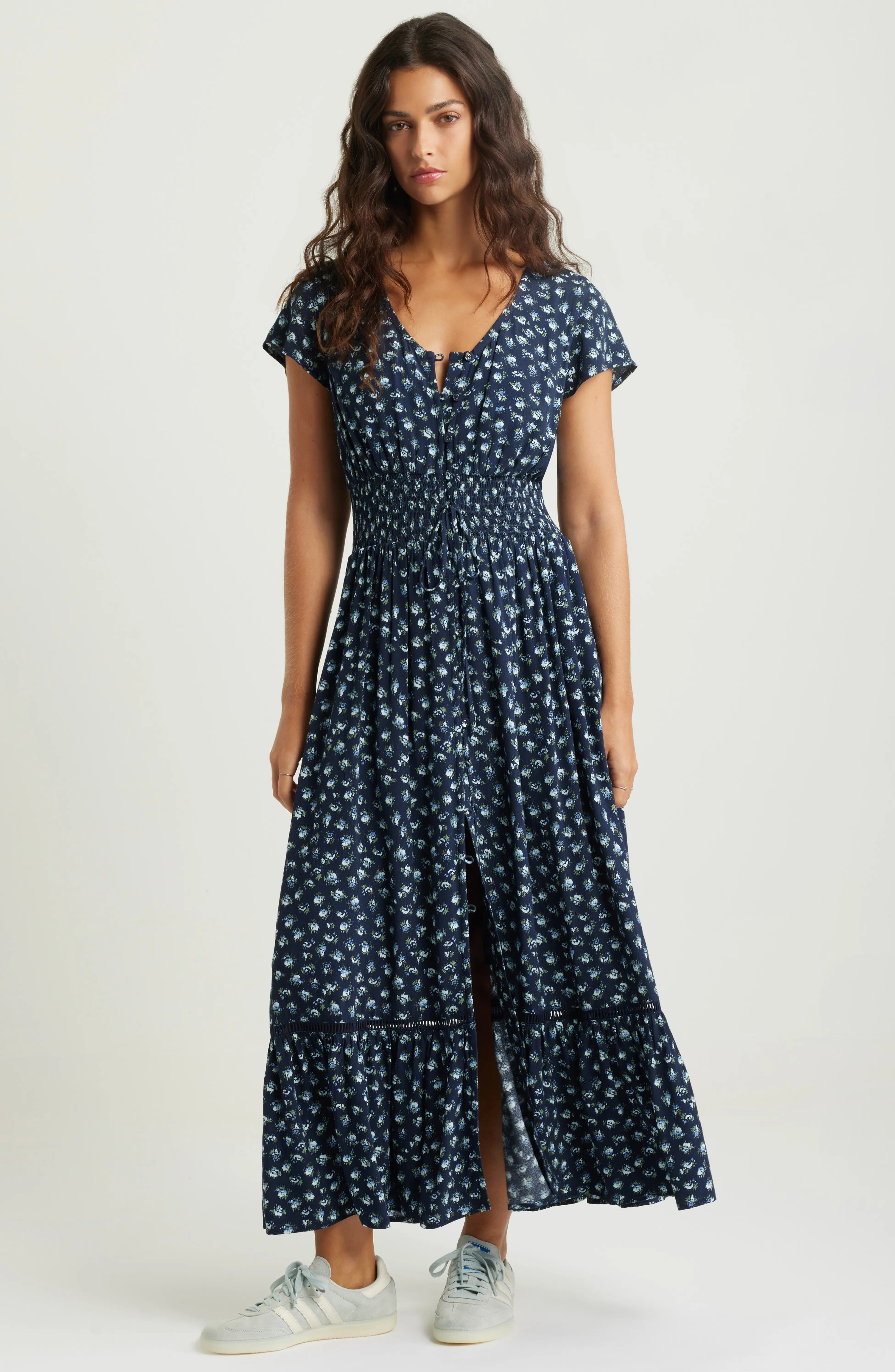A smocked waist shapes the silhouette of this flowery dolman-sleeve maxi designed with airy ladder stitching and a ruffled perfect-for-twirling skirt.